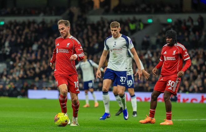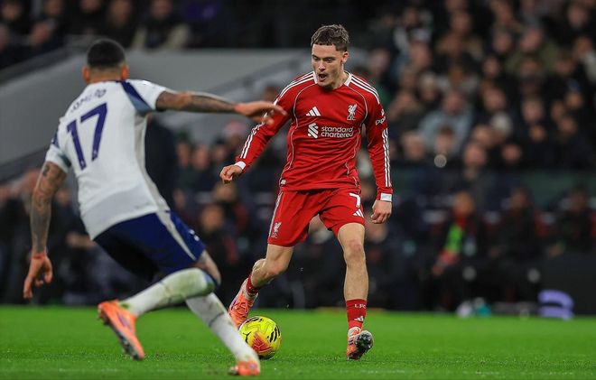 比赛第30分钟,哈维·西蒙斯在前场逼抢范戴克时,一脚踩踏在了对方的小腿上,主裁判出示黄牌警告,不过在第33分钟主裁回看VAR后改判红牌,将西蒙斯罚下,而这张红牌是全场的分水岭。原本热刺开场极具侵略性,但这次蹬踏范戴克的行为让热刺陷入长达60分钟的少打一人的窘境。
